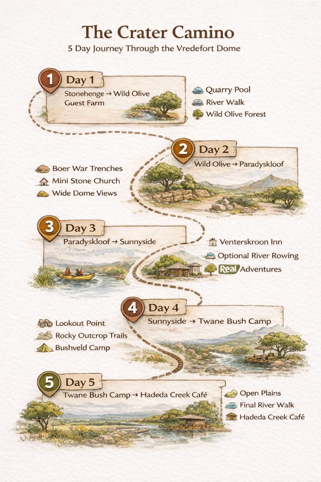 1) The Full board Package : The Crater Camino is a 5-day slackpacking – 80 km journey through the Vredefort Dome, including accommodation, meals and luggage transfers between stops. 4 Night’s – 5 days
