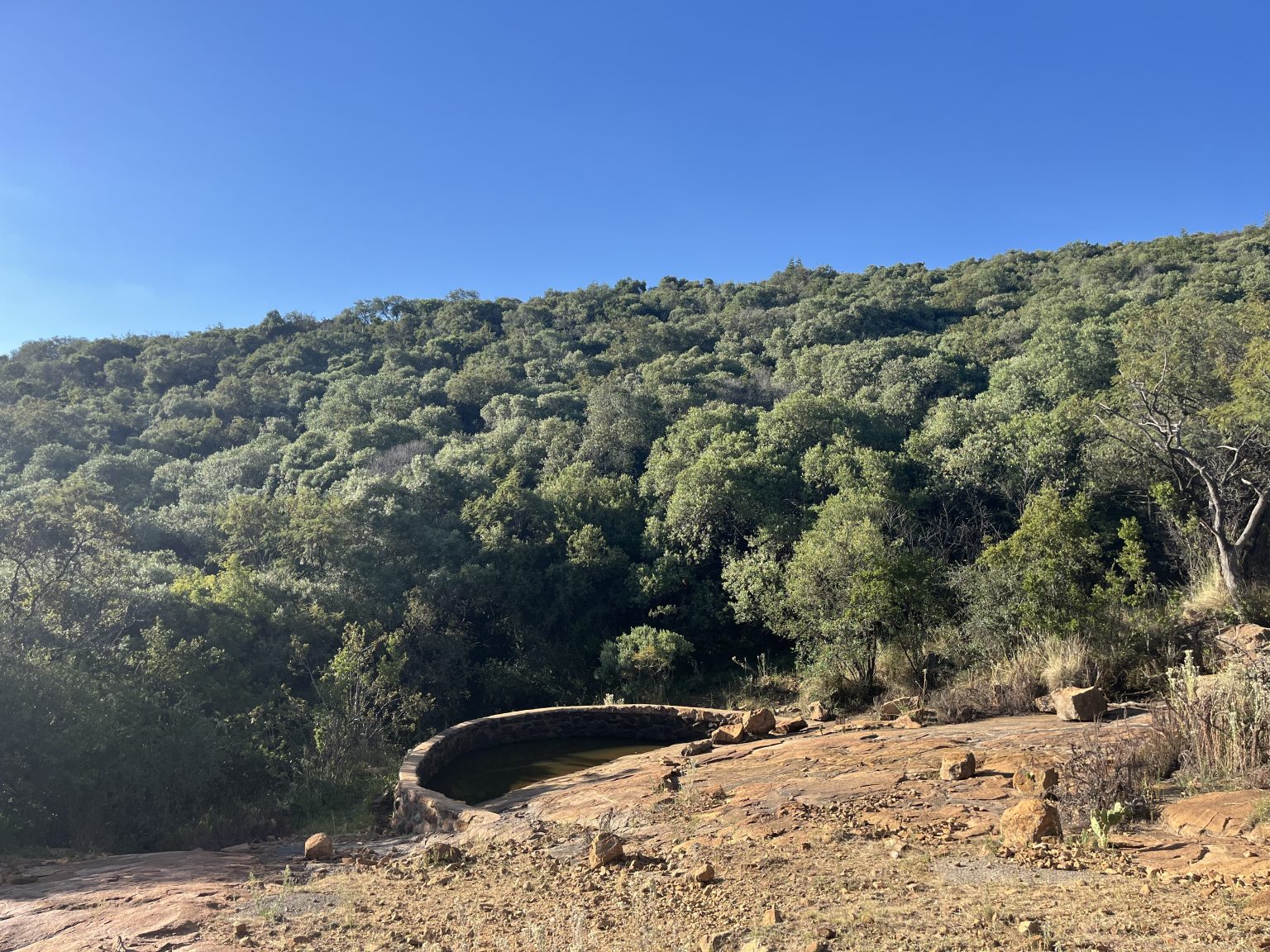 The trail rises gently through rolling bushveld hills where history lies hidden in the landscape. Along the route you encounter Boer War trenches and a charming miniature church before descending into the peaceful valley of Paradyskloof